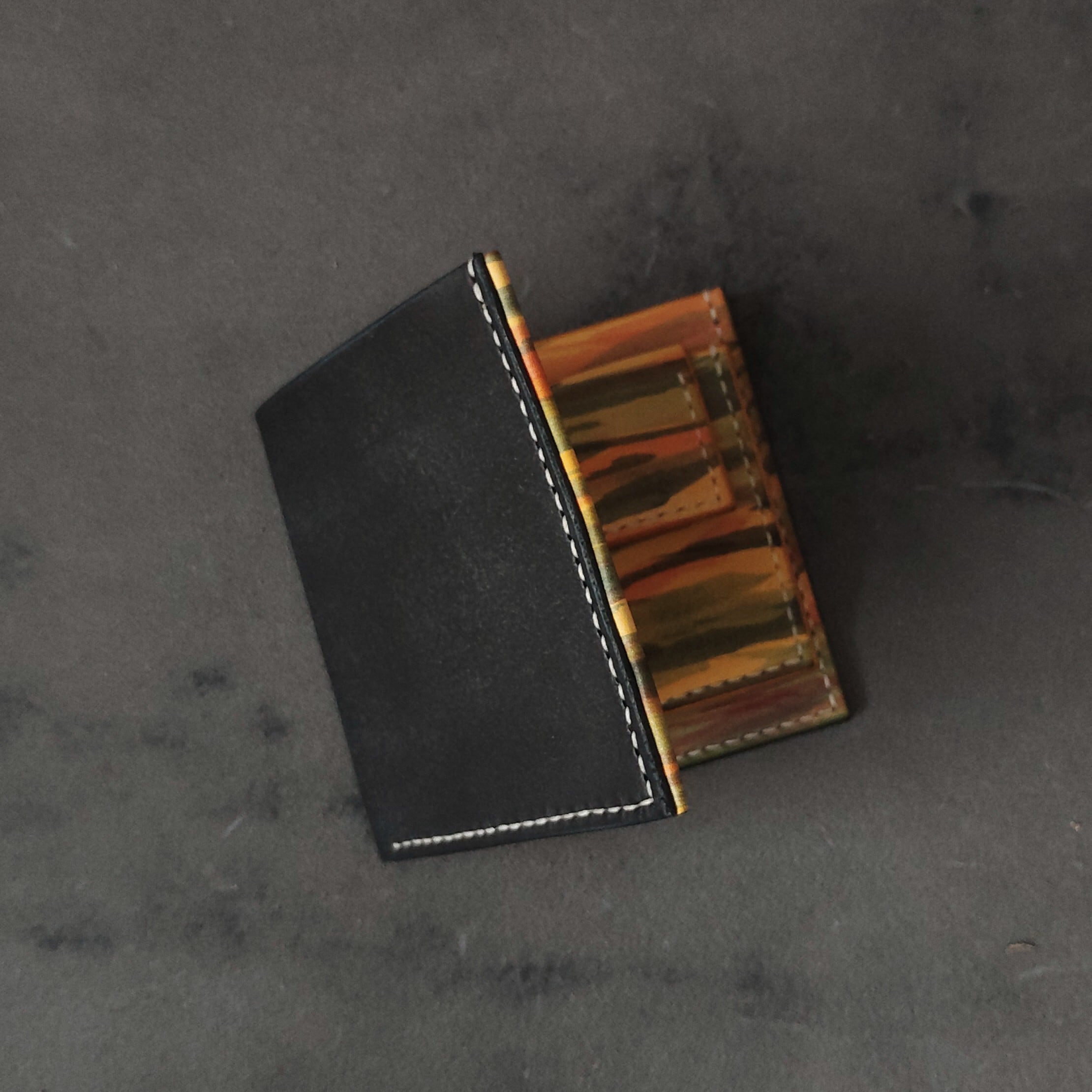 国産の高級タンニンなめしレザーである姫路レザーを手染めし、手縫いで仕立てました。