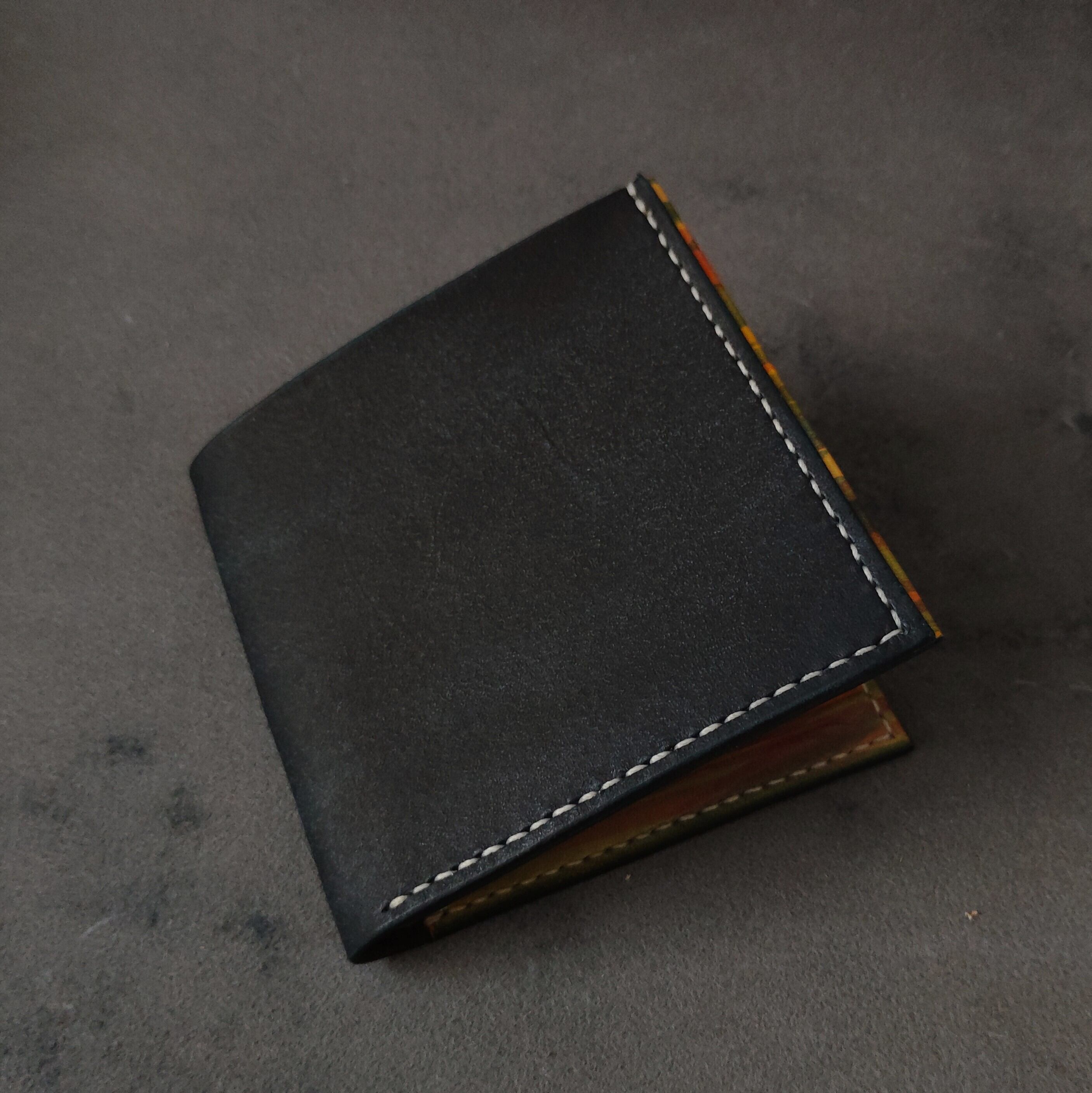シンプルな外装からカラフルな内装がのぞくデザインが個性的な二つ折り財布です。