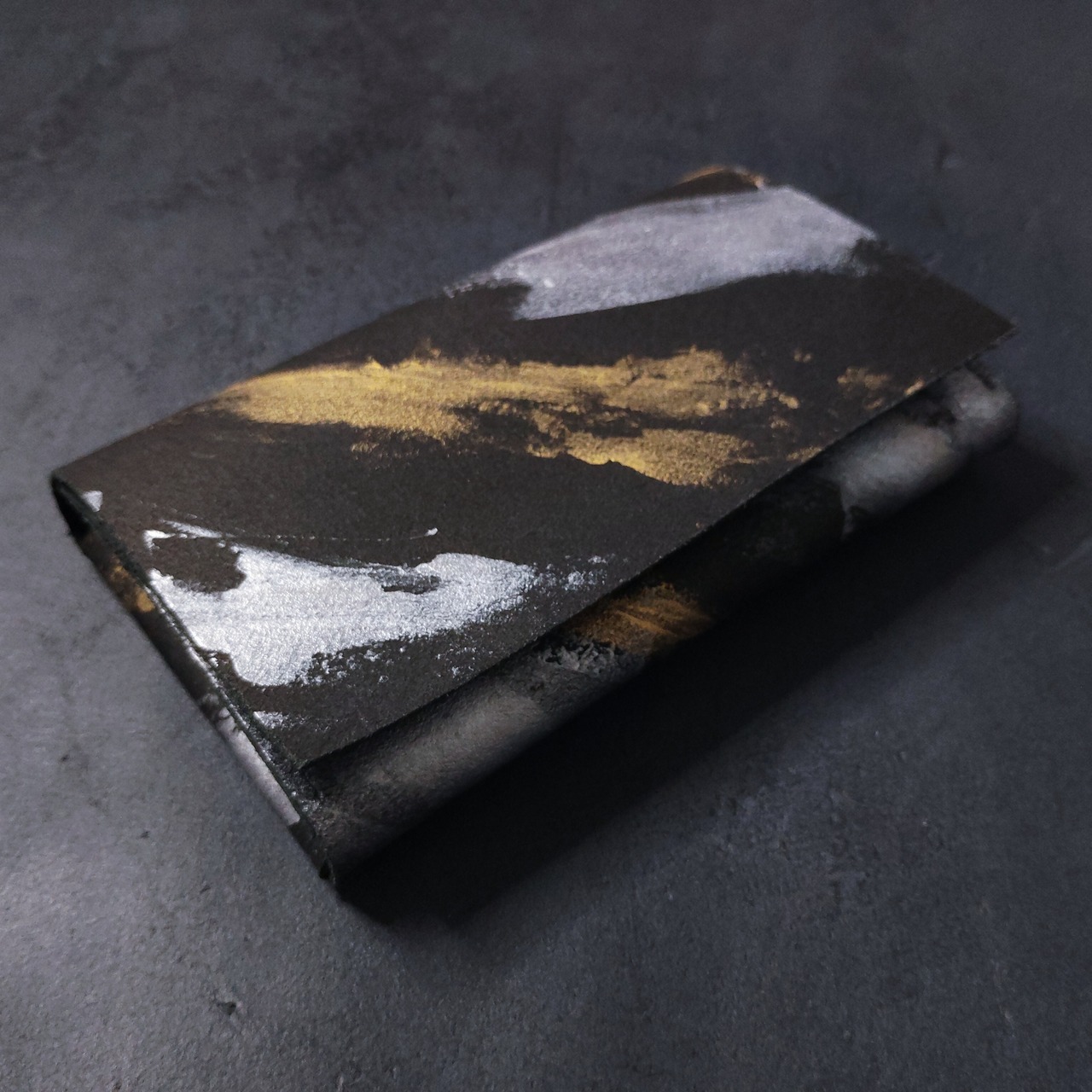 従来廃棄される事も多い床革に、手作業でペイントを行い、圧力をかけて加工する事でハリツヤのあるレザーに仕上げています。